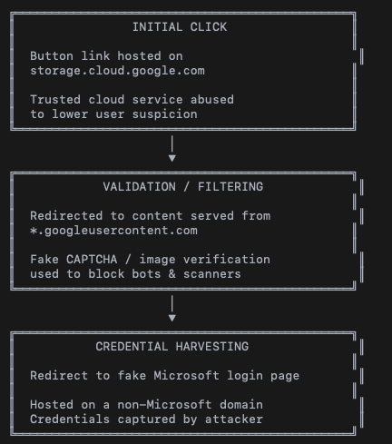 El ataque emplea un flujo de redirección en múltiples etapas cuidadosamente diseñado para generar confianza y eludir los controles de seguridad. En primer lugar, las víctimas son dirigidas a enlaces alojados en servicios legítimos de Google Cloud, lo que reduce las sospechas iniciales. Posteriormente, el proceso incluye una falsa verificación tipo CAPTCHA destinada a bloquear herramientas automáticas de análisis. Finalmente, los usuarios son redirigidos a una página falsa de inicio de sesión de Microsoft, alojada en un dominio externo, donde se produce el robo de credenciales.